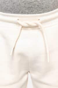 85% coton biologique / 15% polyester recyclé post-consumer. Coton peigné. Molleton gratté 3 fils LSF (Low Shrinkage Fleece : molleton pré-rétréci). Lavés aux enzymes. Ceinture élastiquée en bord cote 1 x 1 avec cordon de serrage rond en coton biologique. Oeillet boutonnière pour cordon ceinture. Poches latérales et une poche arrière passepoilée. Ourlet bas de jambes double surpiqûre.