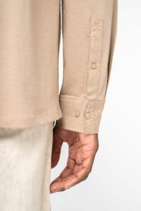 100% coton biologique. Jersey simple. Coupe droite. Lavé aux enzymes. Col en matière principale avec pied de col. Bande de propreté intérieure en jersey ton sur ton. Patte de boutonnage avant avec boutons recyclés ton sur ton effet nacré. Patte capucin aux poignets avec boutonnage. Coutures latérales simple piqure. Empiècement haut du dos. Ourlet double surpiqûre bas de vêtement. Bas de vêtement arrondi.