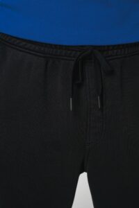85% coton biologique, 15% polyester recyclé post-consumer. Coton peigné. Lavé aux enzymes. French Terry. Molleton non gratté 3 fils LST (Low Shrinkage Terry : molleton pré-rétréci). Ceinture élastiquée. Cordon de serrage plat avec embout en plastique recyclé, mat ton sur ton. Œillets brodés. Fausse braguette. Doubles surpiqûres fourche devant et dos pour plus de maintien. Poches côtés devant, poches goussets latérales plaquées sur les côtés du vêtement avec rabats. Poches plaquées dos. Ourlet bas de jambe double surpiqûres. Vêtement teint après montage : les couleurs peuvent légèrement varier d'une pièce à l'autre. Ce produit est susceptible de déteindre au contact avec des surfaces ou vêtements clairs.