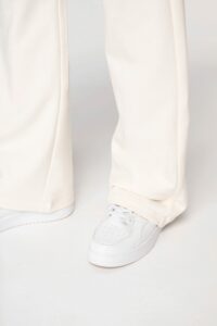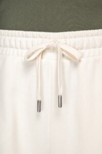 85% coton biologique / 15% polyester recyclé. Coton peigné. Coupe large. Intérieur molleton non gratté (French Terry). 3 fils LST (Low Shrinkage Terry : pré-rétréci). Lavé aux enzymes. Œillets brodés. Poches côtés minimalistes. Ourlet simple surpiqûre bas de vêtement. Ceinture élastiquée avec surpiqûres, cordon de serrage plat en coton biologique et embout en métal recyclé.