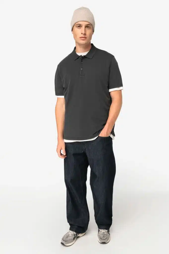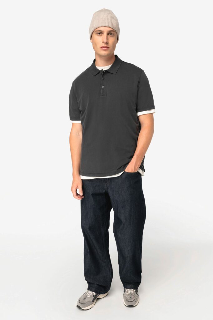 100% coton biologique. Coton peigné. Maille jersey. Coupe droite. Coutures latérales. Lavé aux enzymes. Aspect délavé. Col en bord côte 1 x 1. Patte de boutonnage à 3 boutons avec une surpiqûre en finition. Boutons en plastique recyclé ton sur ton effet nacré. Bande de propreté en matière principale ton sur ton en finition intérieur de col. Fentes côtés et renfort épaule en matière principale. Vêtement teint en pièce après montage : les couleurs peuvent varier d’un produit à l’autre. Ce produit est susceptible de déteindre au contact avec des surfaces ou vêtements clairs.