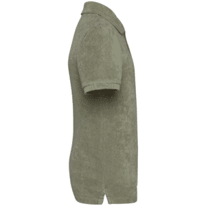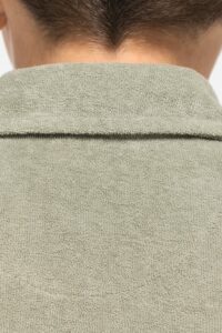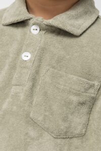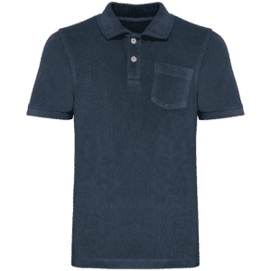 80% coton biologique / 20% polyester recyclé post-consumer. Fabriqué au Portugal. Coton peigné. Matière éponge. Coupe droite. Coutures latérales. Lavé aux enzymes. Poche plaquée poitrine. Demi-lune au dos. Col en matière principale. Manches courtes avec finition bas de manches en bord côte 1 x 1 et surpiqûre aux emmanchures. Patte de boutonnage avec 2 boutons en plastique blanc effet nacré. Renfort épaule en matière principale. Ourlet double surpiqûre bas de vêtement. Fentes latérales et encolure avec bande de propreté intérieure en chevrons ton sur ton.