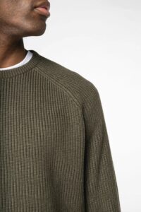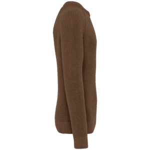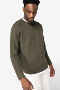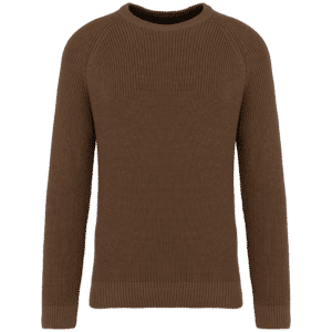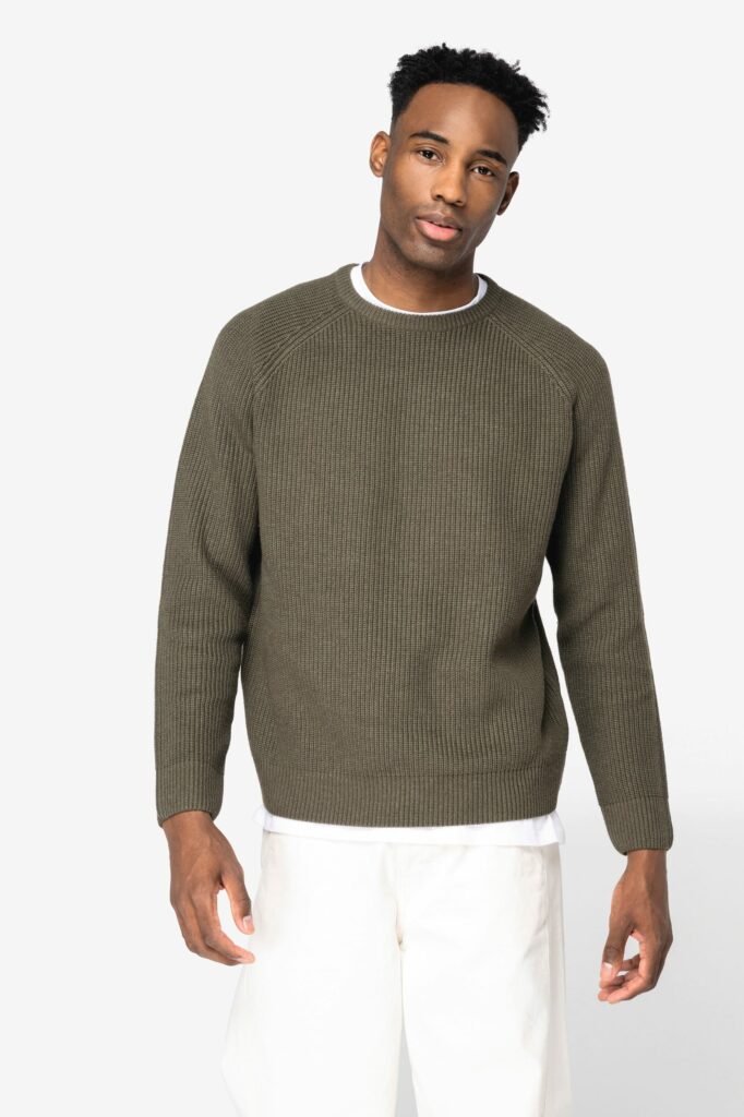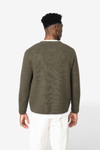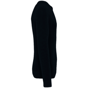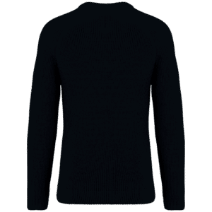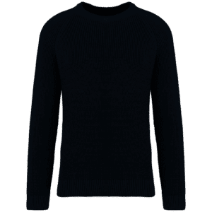 50% coton biologique / 50% polyester recyclé post-consumer. Jauge 5. Coupe droite. Patch de personnalisation intérieur col. Bande de propreté en chevrons constratée Navy Blue sur tous les coloris. Manches raglan. Entièrement tricoté en côte 1 x 1 et montage « Fully Fashion ». Poids moyen en taille L : 850 g.