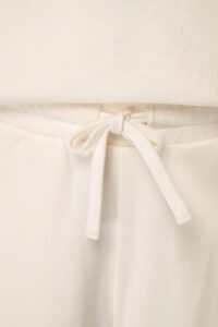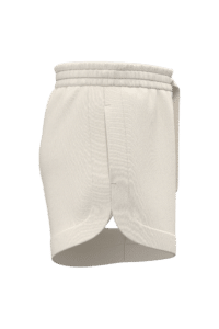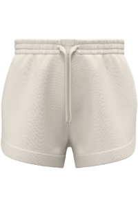 85% coton biologique, 15% polyester recyclé post-consumer. Coton peigné. Lavé aux enzymes. French Terry. Molleton non gratté 3 fils LST (Low Shrinkage Terry : molleton pré-rétréci). Empiècement bas et côtés de short doublés devant et dos. Ceinture élastiquée avec surpiqûres. Œillets brodés et cordon plat avec finition piqûre nervure, maintenu par un point d'arrêt sur la ceinture. Poches côtés minimalistes. Fentes côtés.