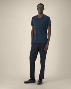 Biais au col dans la matière principale Bande de propreté intérieur col dans la matière principale Manches montées Surpiqûre double étroite en bas de manches et bas de corps