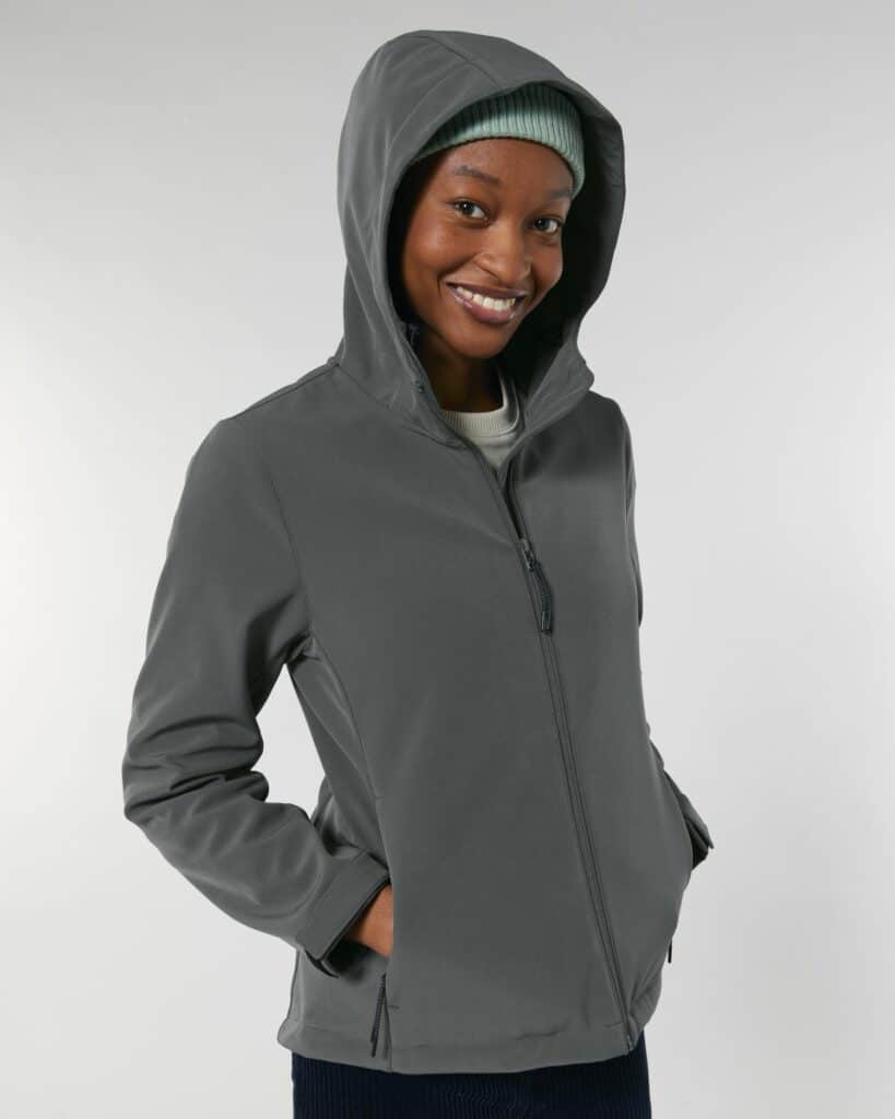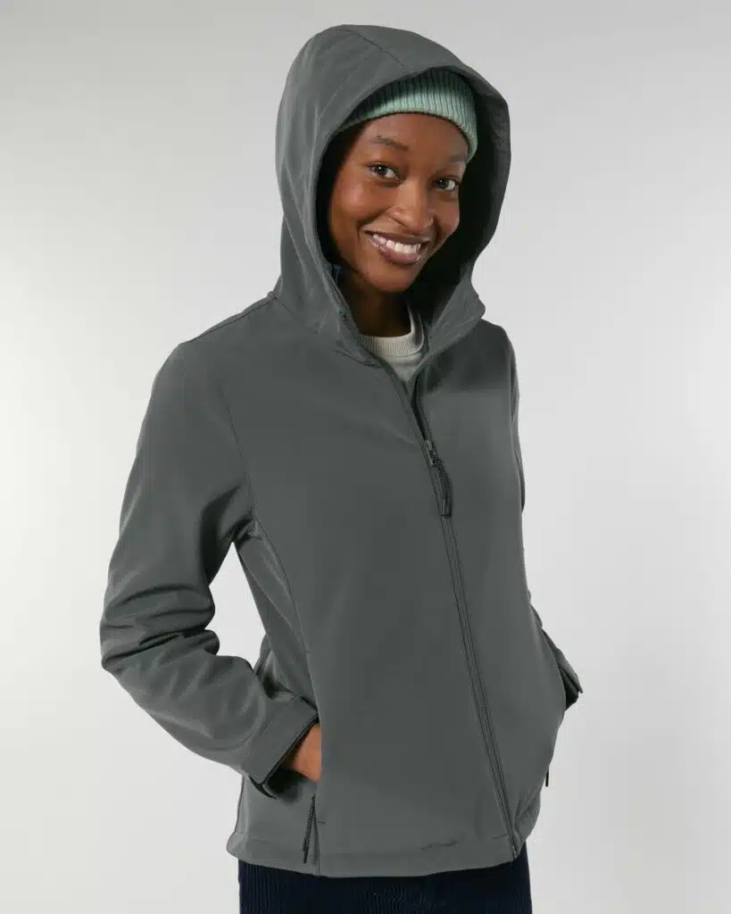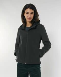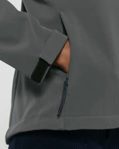 Col montant avec capuche à empiècements Zip nylon inversé milieu devant Manches montées Poches passepoilées zippées avec tirettes élastiques réfléchissantes Ouverture de la capuche et bas de corps ajustables avec cordon élastique et stoppeurs en plastique Bas de manches ajustable par velcro Toutes les coutures intérieures finies avec un biais recyclé Doublure en polaire anti-boulochage Tissu 3 couches entièrement contrecollé avec membrane TPU recyclée Tissu softshell bi-extensible pour un meilleur ajustement et une meilleure tenue Déperlant jusqu'à 10 000 mm avec Bionic Finish® Eco Respirant jusqu'à 3 000 g/m²/24h Coupe-vent