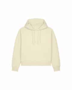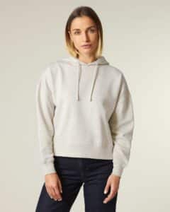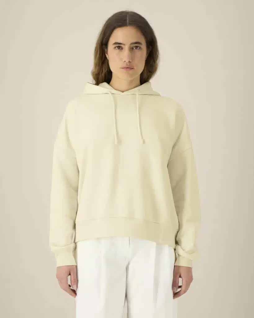 Capuche doublée dans la matière principale Cordon de serrage plat ton sur ton Œillets brodés Bande de propreté en gros-grain Demi-lune dans la matière principale au dos du col Manches montées avec épaules tombantes Côte 1x1 au bas de manches et bas de corps Surpiqûre double sur l'ensemble