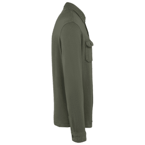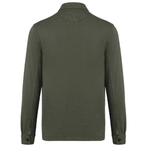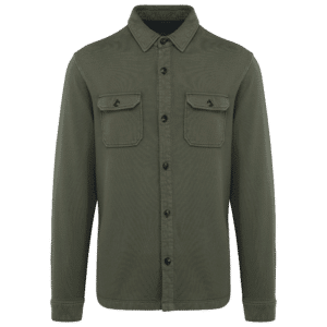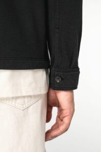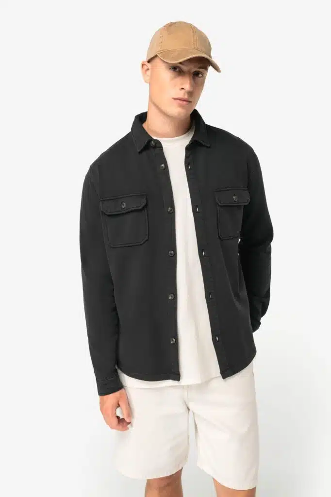 100% coton biologique. Coupe standard. Maille. Molleton gratté 3 fils. Aspect délavé. Patte de boutonnage avec boutons contrastés effet corne en plastique recyclé. Poignet boutonnée avec fente. Col avec pied de col. Finition encolure bande de propreté en chevrons ton sur ton. Deux poches plaquées avec rabat et bouton. Ourlet double surpiqûre bas de vêtement. Demi-lune au dos. Vêtement teint en pièce après montage : les couleurs peuvent légèrement varier d'un produit à un autre. Ce produit est susceptible de déteindre au contact avec des surfaces ou vêtements clairs.