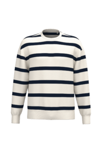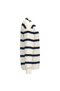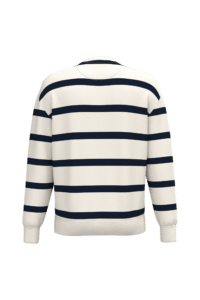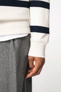 85% coton biologique / 15% polyester recyclé post-consumer. Coton peigné. Coupe standard à épaules tombantes. Molleton gratté 3 fils LSF (Low Shrinkage Fleece : molleton pré-rétréci). Rayures marines imprimées sur toute la surface. Lavé aux enzymes. Bord côte 1 x 1 au col, bas de manches et bas de vêtement. Finition intérieur col avec bande de propreté en jersey ton sur ton. Demi-lune au dos.