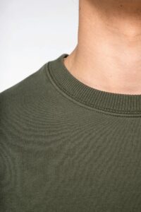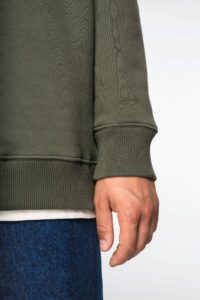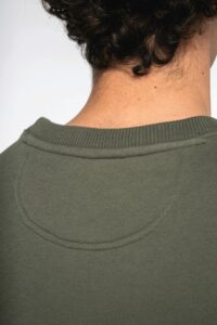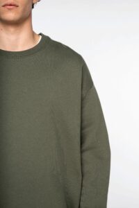100% coton biologique. Fabriqué au Portugal. Coton peigné. Coupe oversize à épaules tombantes. Lavé aux enzymes. Molleton gratté 3 fils LSF (Low Shrinkage Fleece : molleton pré-rétréci). Col, bas de manches et de vêtement en bords côte 2 x 1. Double surpiqûre à cheval sur le col, bas de manches et de vêtement. Finition encolure intérieure bande de propreté en chevrons ton sur ton. Demi-lune au dos.