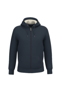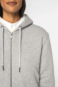 85% coton biologique / 15% polyester recyclé post-consumer. Produit doublé en sherpa écru sur toutes les couleurs : capuche, manches et corps. Coton peigné. Coupe droite. Lavé aux enzymes. Molleton non gratté 3 fils LST (Low Shrinkage Terry : molleton pré-rétréci). Zip milieu devant en métal recyclé. Bord côte 1 x 1 bas de manches et bas de vêtement. Finition intérieur col avec bande de propreté en chevrons ton sur ton. Double surpiqûre à cheval sur emmanchures, bas de manches et bas de vêtement. Capuche 2 panneaux doublée en sherpa, avec surpiqûre et point d’arrêt cordon. Poche kangourou. Cordon rond avec embouts et œillets en métal recyclé. Zip de personnalisation bas de vêtement. Demi-lune au dos.