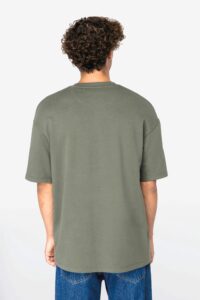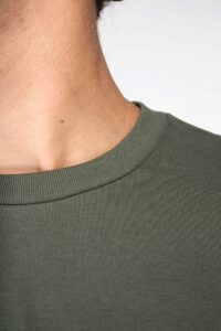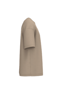 85% coton biologique / 15% polyester recyclé post-consumer. Coton peigné. Coupe oversize à épaules tombantes. Produit hybride entre le sweatshirt et le t-shirt. Molleton 3 fils non gratté LST (Low Shrinkage Terry). 1/2 lune au dos. Lavé aux enzymes. Col en côte 1 x 1. Renfort épaule. Finition double surpiqûre bas de manches et de vêtement. La couleur Raw Natural se distingue par son aspect brut visuellement texturé, parsemée de fines particules visibles à l’œil nu.