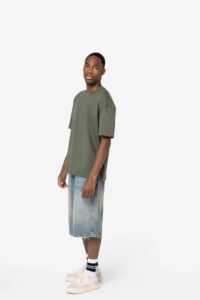 100% coton biologique. Coton cardé. Coupe oversize à épaules tombantes. Coutures latérales. Toucher légèrement « rêche ». Bord côte col 1 x 1. Bande de propreté intérieure col en matière principale. Renfort épaule. Ourlet simple surpiqûre bas de manches et bas de vêtement.