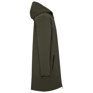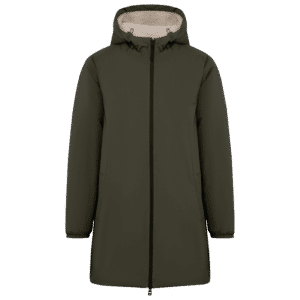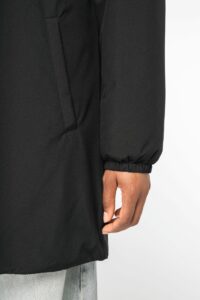 100% polyester recyclé post-consumer. Coupe standard. Imperméable 4000mm. Respirant 3000 g/m²/24h. Produit doublé en sherpa écru sur toutes les couleurs, capuche et corps. Manches doublées en taffetas 210T écru sur toutes les couleurs et rembourrées. Zip imperméable recyclé avec double tire-zip en métal recyclé. Parmenture en finition intérieure en tissu principal. Deux poches côtés passepoilées avec zip inversé. Capuche 3 panneaux avec cordon de serrage et stoppeurs recyclés intérieurs. Bas de manches élastiqués. Poche passepoilée intérieure côté cœur. Patch de personnalisation intérieur en tissu principal. Zip de personnalisation poitrine et bas de vêtement. Tissu avec membrane intérieure et coutures thermo soudées permettant au produit d'être imperméable.